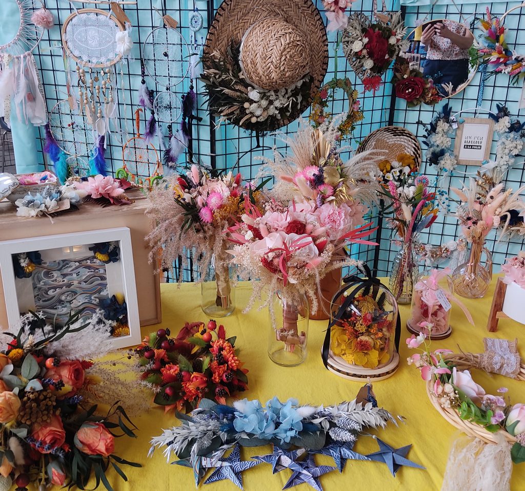 Avec des bouquets, des couronnes de fleurs, des cloches en verre, des soliflores,des accessoires fleuris et bien d’autres objets chinés par ci par là pour vos événements festifs ou pour une décoration de votre intérieur.