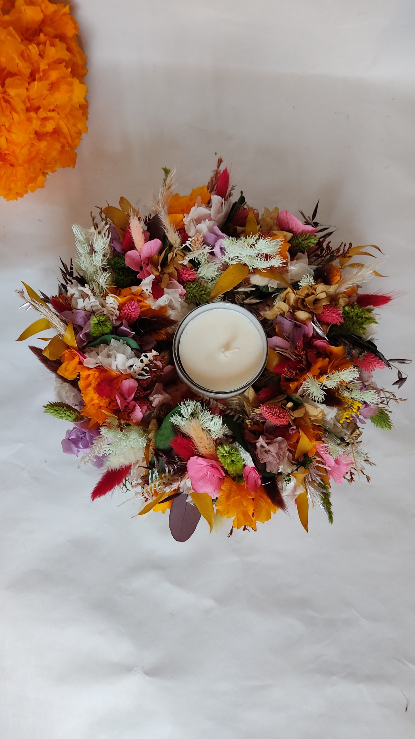 Voici mes couronnes de fleurs séchées et stabilisées, pensées comme un écrin pour vos bougies 🕯️💐 ici avec des bougies de chez @_alianature_