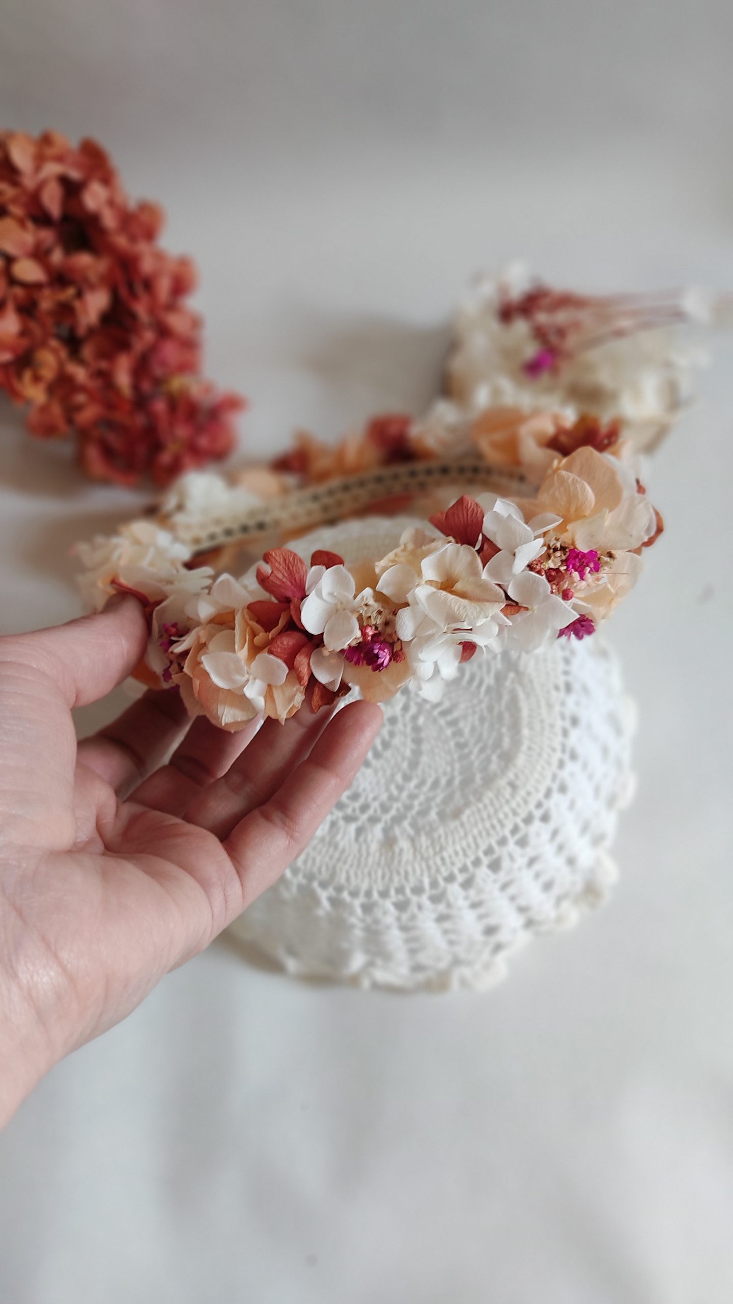 Ce serre-tête fleuri, réalisé à la main avec des fleurs séchées et stabilisées, est l’accessoire idéal pour une touche bohème, romantique et naturelle. Parfait pour un mariage, un évènement festif, un shooting photo, gargen parties, soirée d’été.