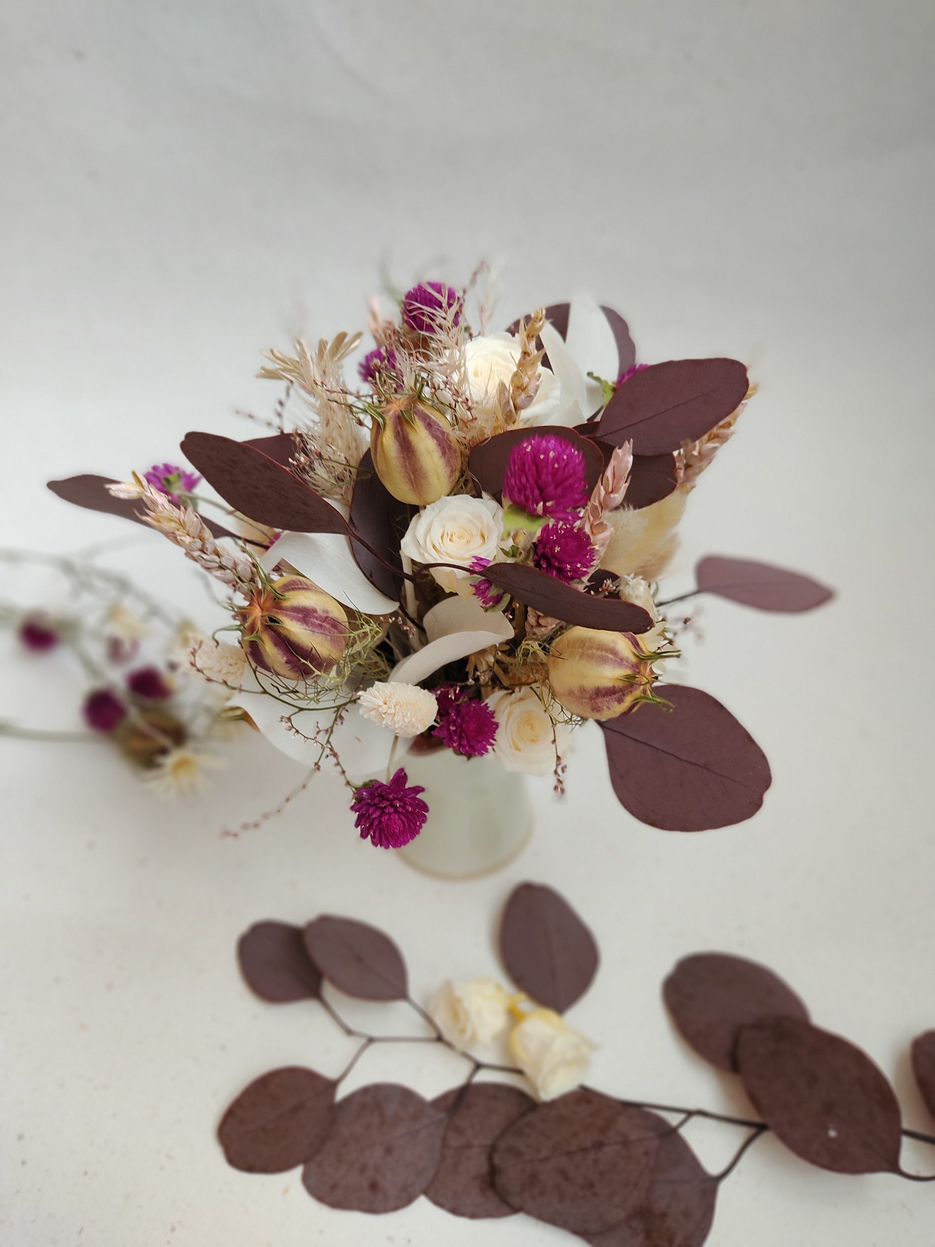Je compose mes assemblages floraux avec des végétaux et des montages adaptés à chaque univers, et donc à chaque création. L’ensemble est valorisé par des matériaux décoratifs allant du ruban au coton, en passant par le fil de laiton et le fer.